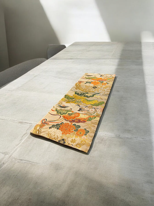 Golden Table Runner with Elegant Flowers and Cranes(004-TR)