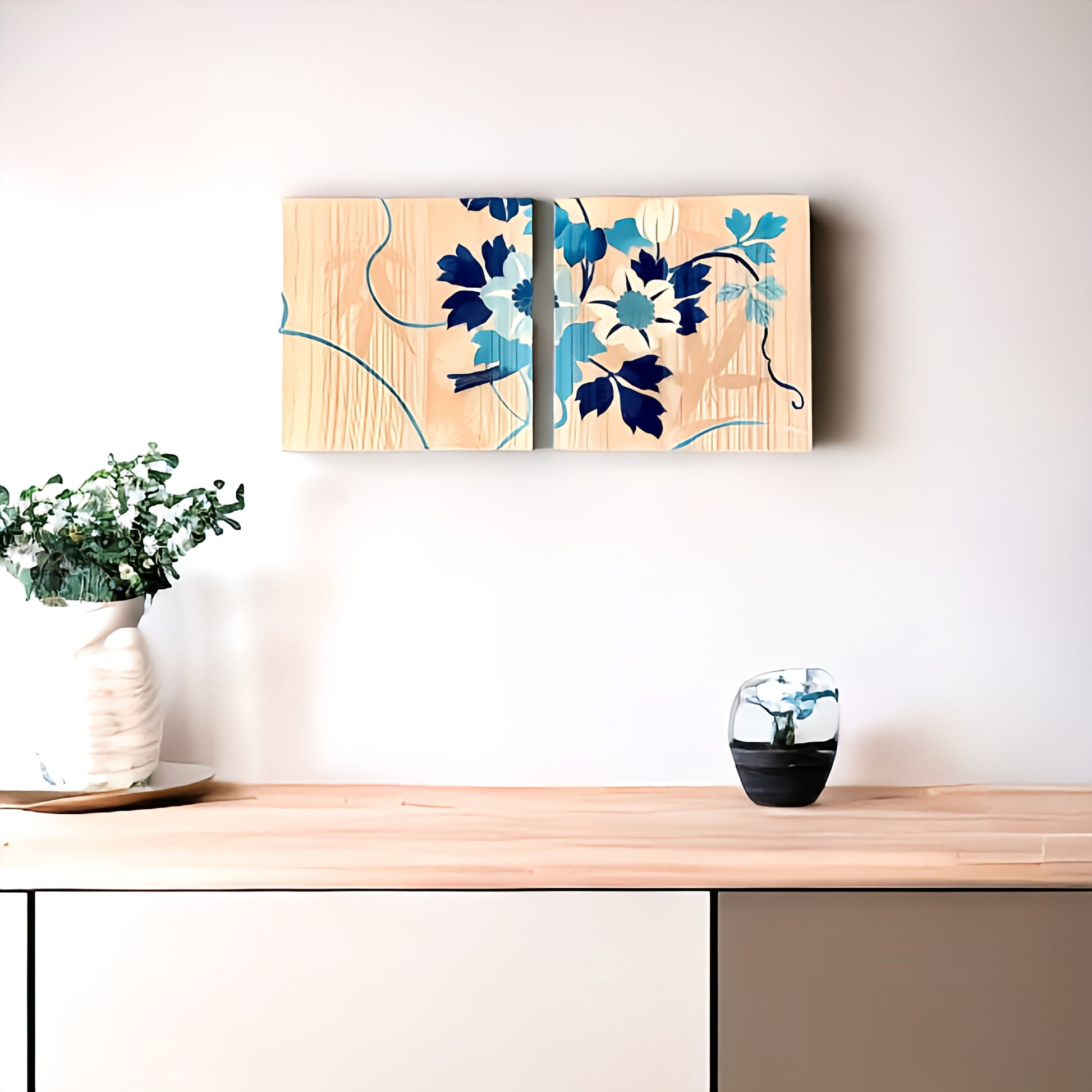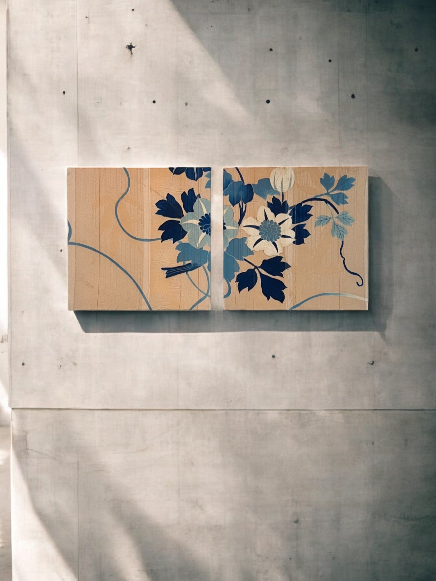 This stunning fabric board is a unique piece of art, crafted from repurposed West Kyoto Nishijin textile, a renowned Japanese silk fabric. The board features a captivating floral pattern, showcasing the exceptional craftsmanship of traditional Japanese weaving techniques. The board displays a beautiful array of flowers in shades of blue, cream, and black, creating a visually striking and harmonious design. The natural wood frame provides a perfect complement to the vibrant floral motif, resulting in a piece that would seamlessly integrate into any decor. This fabric board is not only a beautiful decorative item but also a testament to the rich cultural heritage of Kyoto's textile industry. It would make a wonderful addition to any home, office, or creative space, serving as a source of inspiration and a focal point for the room. The intricate details and the thoughtful craftsmanship make this fabric board a truly unique and captivating piece of art.