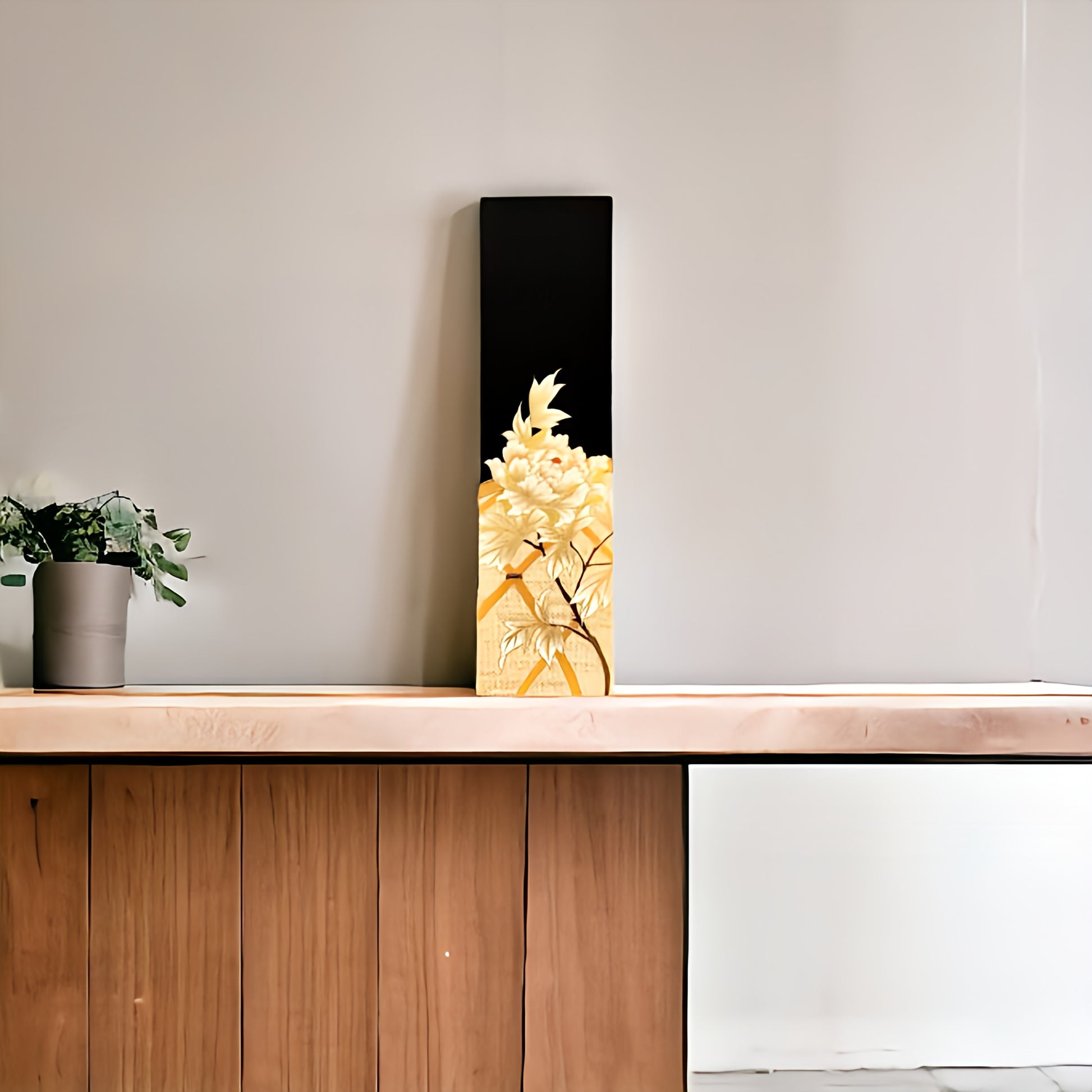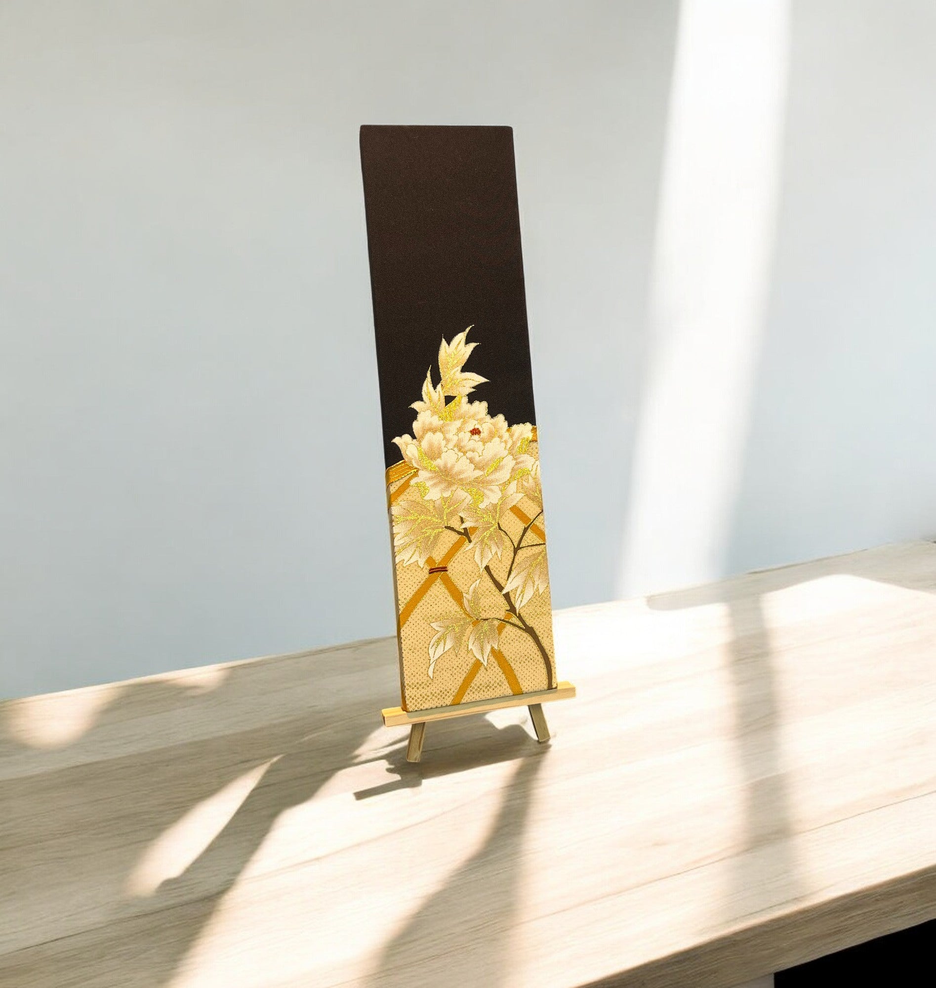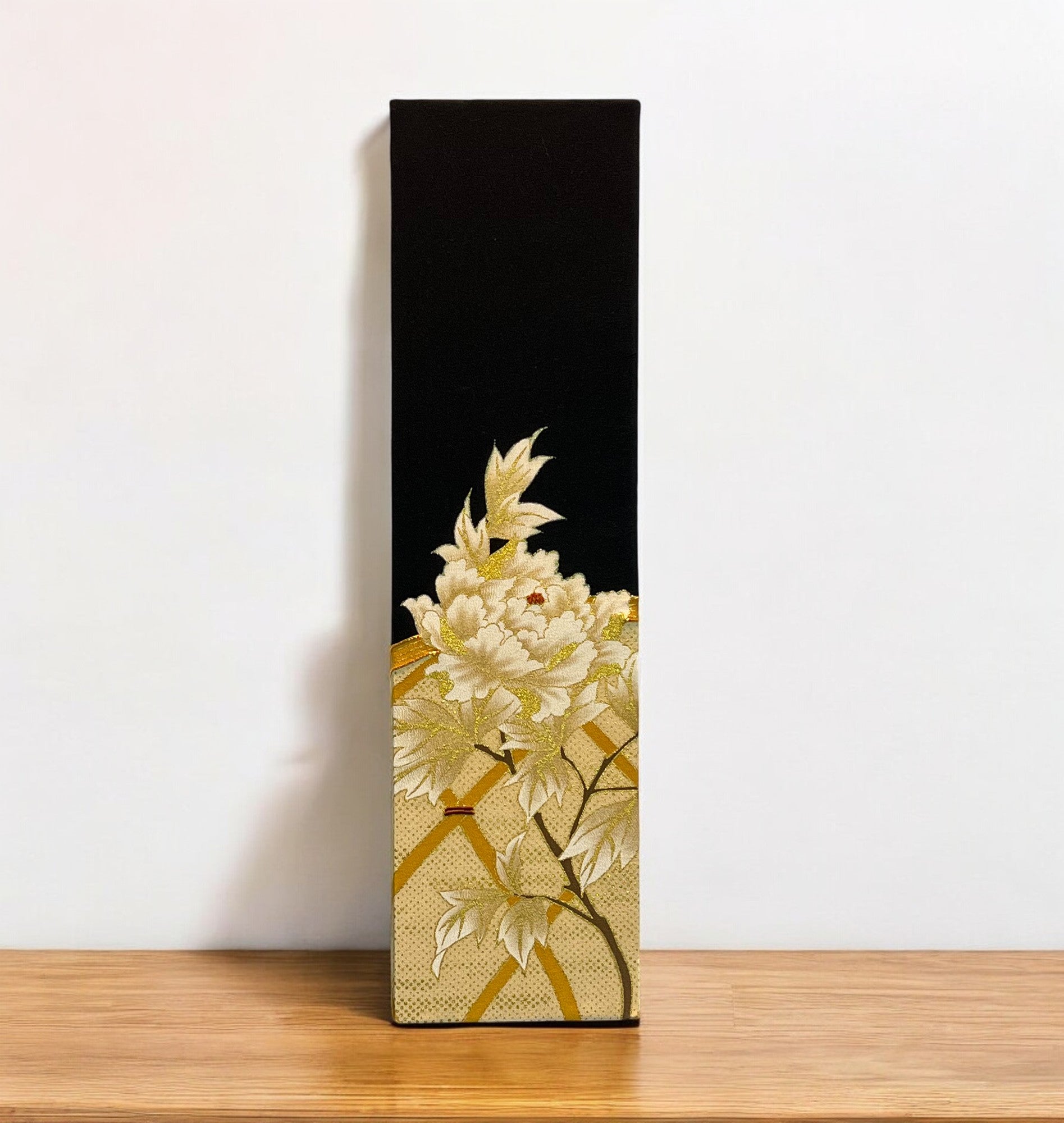 This captivating fabric board is a stunning work of art, crafted from repurposed West Kyoto Nishijin textile, a renowned Japanese silk fabric. The board features an elegant design showcasing vibrant ivory-colored flowers against a contrasting black background, showcasing the exceptional craftsmanship of traditional Japanese weaving techniques. The intricate floral motif, with its delicate petals and lush foliage, creates a visually striking and harmonious composition. The natural wood frame provides a perfect complement to the artwork, seamlessly integrating it into any space. This fabric board would make a wonderful addition to any home, office, or creative environment, serving as a focal point and a source of inspiration. Beyond its aesthetic appeal, this piece is a testament to the rich cultural heritage of Kyoto's textile industry. The skilled artisans who crafted this board have preserved the time-honored techniques of Nishijin weaving, resulting in a truly unique and captivating work of art. Whether displayed on its own or as part of a curated gallery wall, this fabric board is sure to captivate and elevate any space it graces.