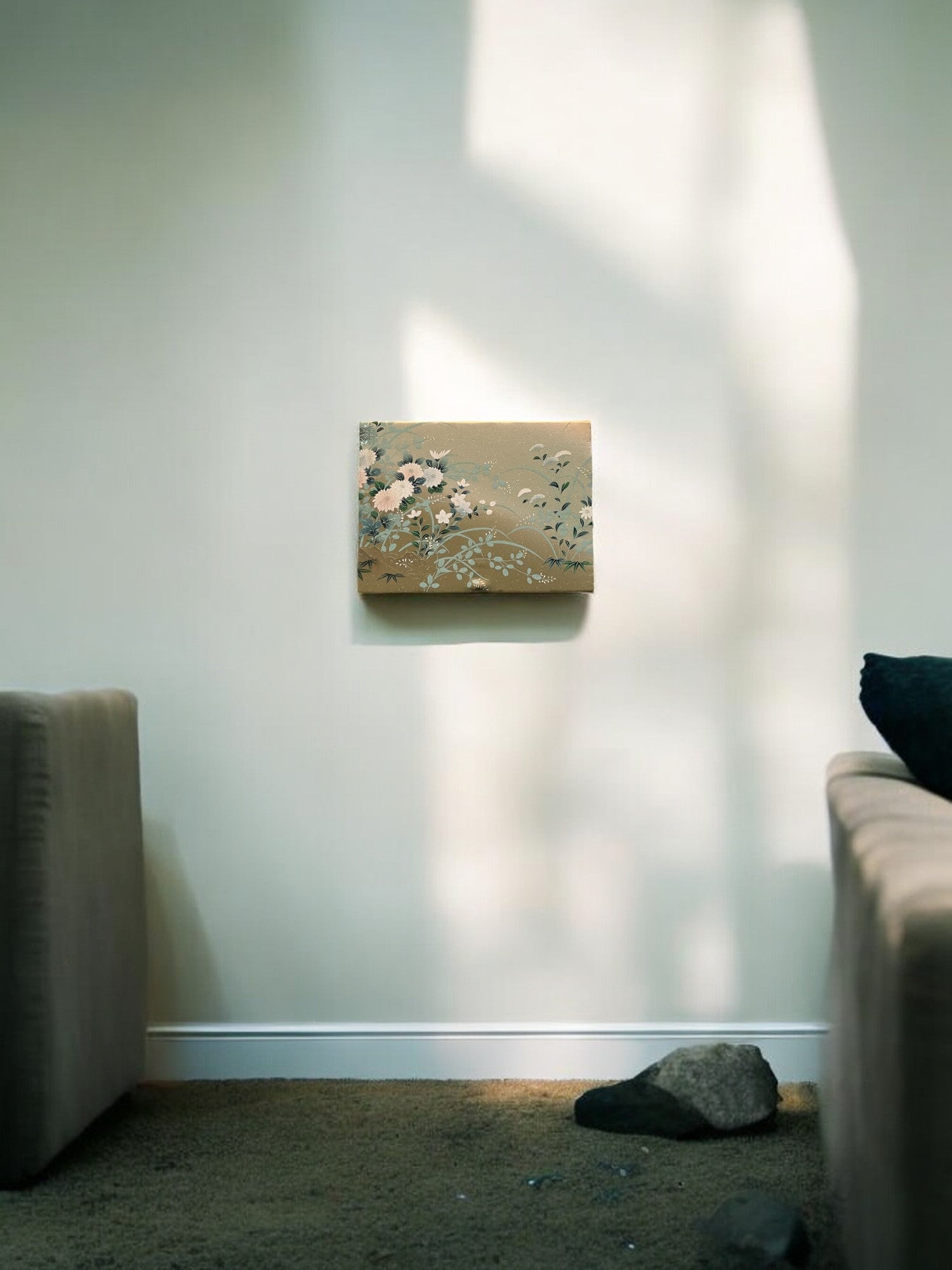 This elegant fabric board features a stunning gold-accented floral and bird design created using Kyoto's traditional Nishijin woven fabric, beautifully repurposed and crafted into a decorative piece. Its exquisite color palette and intricate patterns are hallmarks of its design, bringing a touch of sophistication to any interior. The handwoven texture reflects the meticulous craftsmanship of artisans. Complete with a display stand resembling a frame, it makes a perfect accent for your living room or office. Experience the timeless aesthetic of Kyoto's traditional artistry with this exceptional piece.