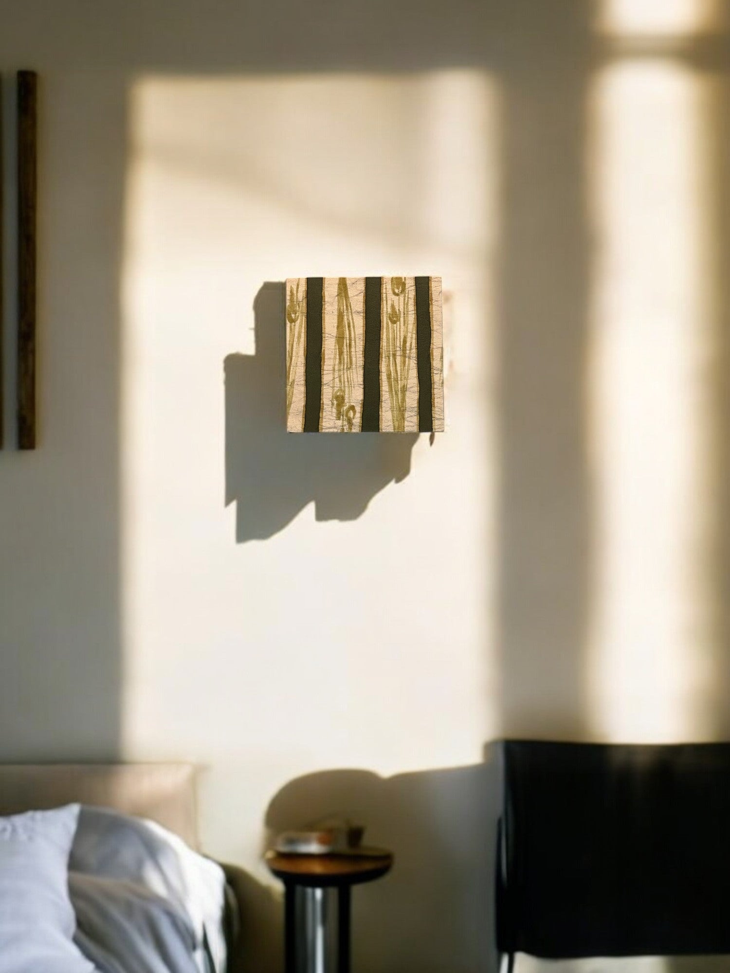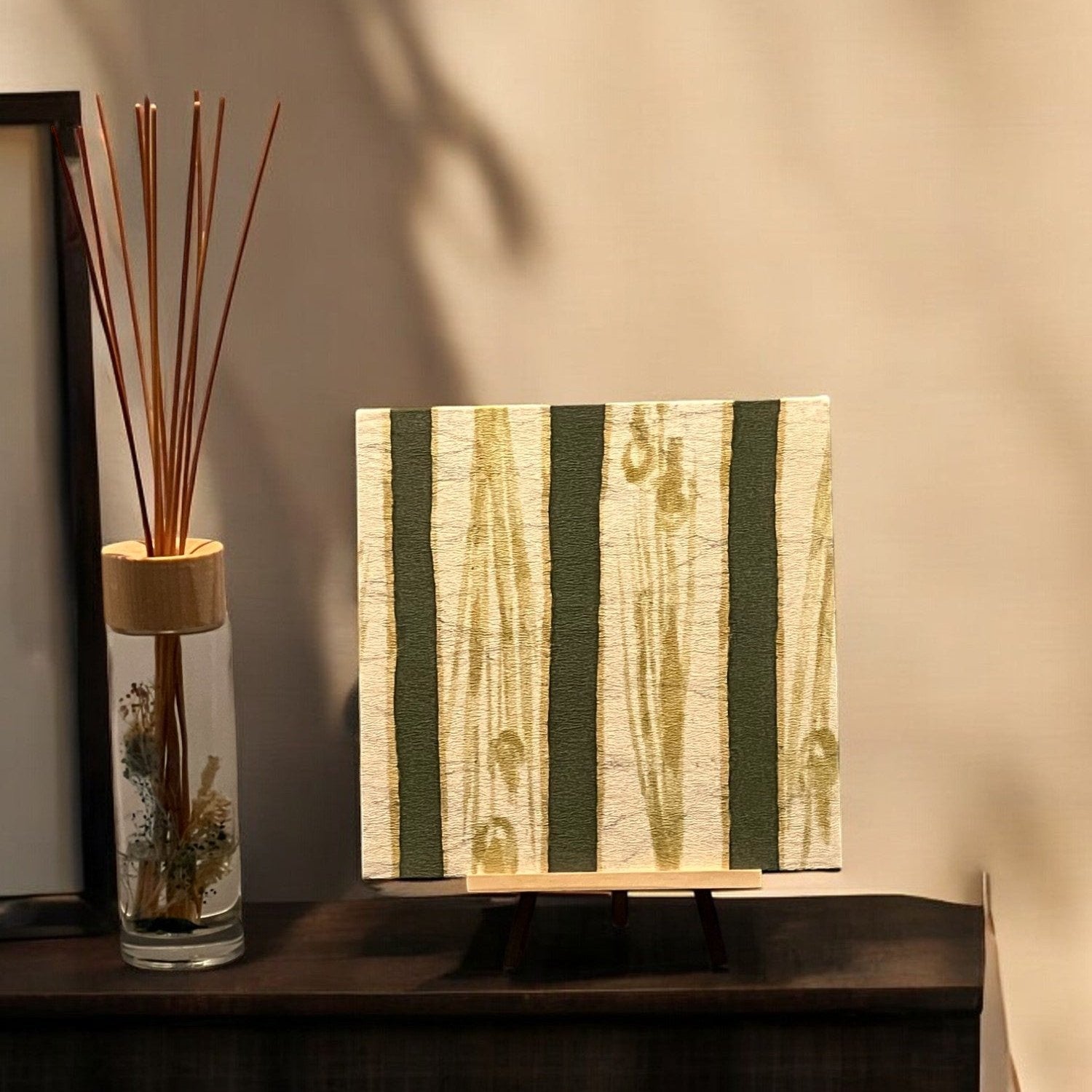 This is a luxurious fabric board made by remaking Kyoto's traditional Nishijin textile fabric. The green stripes and delicate gold patterns harmonize beautifully, and the design is characterized by a Japanese-style feel. The elegant texture and luster unique to the fabric will add a sophisticated accent to your room's interior. It's light and easy to handle, and the included stand makes it easy to display. You can enjoy the traditional beauty of Kyoto in various spaces such as the living room, Japanese-style room, and office. Be sure to try this unique and breathtaking dish.